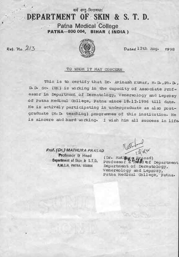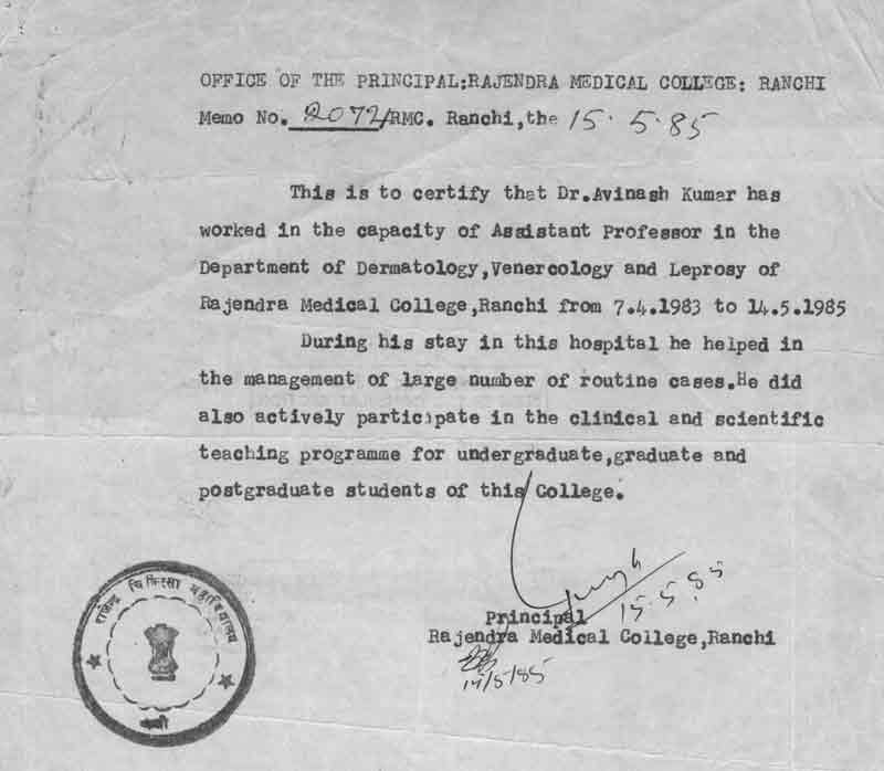 I joined the permanent teaching cadre in year 1983. I was appointed in the capacity of Assistant Professor in Department of Dermatology at Rajendra Institute of Medical Sciences located at Ranchi which at present is the capital of Jharkhand State. I worked there from 07/04/1983 to 14/051985. Department of Dermatology of Rajendra Institute of Medical Sciences (RIMS), Ranchi had the facilities of Undergraduate and Postgraduate Teaching both. The institute was established in 1960 and was originally called Rajendra Medical College.