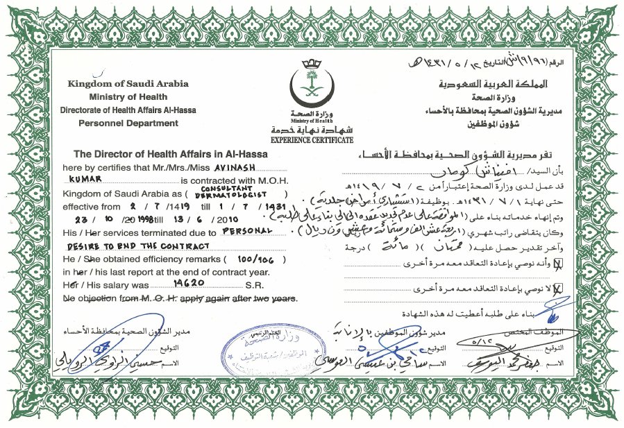 In the year 1998 private practice in Bihar was banned. At the same time I got an offer to work in Saudi Arabia. I joined King Fahad Hospital at Al Hofuf(KFHH) in the capacity of Consultant Dermatologist on 22/10/1998. Within a year I was made Head of Department of Department of Dermatology. I continued to work their until 13/06/2010. There are five similarly built hospitals in the Kingdom of Saudi Arabia. They all are the best hospitals working under Ministry of Health, Saudi Arabia. Only highly qualified and experienced doctors are hired to work in these hospitals. Although these hospitals are not teaching hospital but they are very passionately involved with continuing medical examination (CME) and quality control activities. There is separate and independent Quality Control and CME departments that are passionately involved in their respective activities. Each working medical professional has to achieve already set score of points to renew their contract each year. General Medical Council of UK use to recognize the working experience acquired at these hospitals as an equivalent to their prerequisites to become legible to appear for MRCP examination.